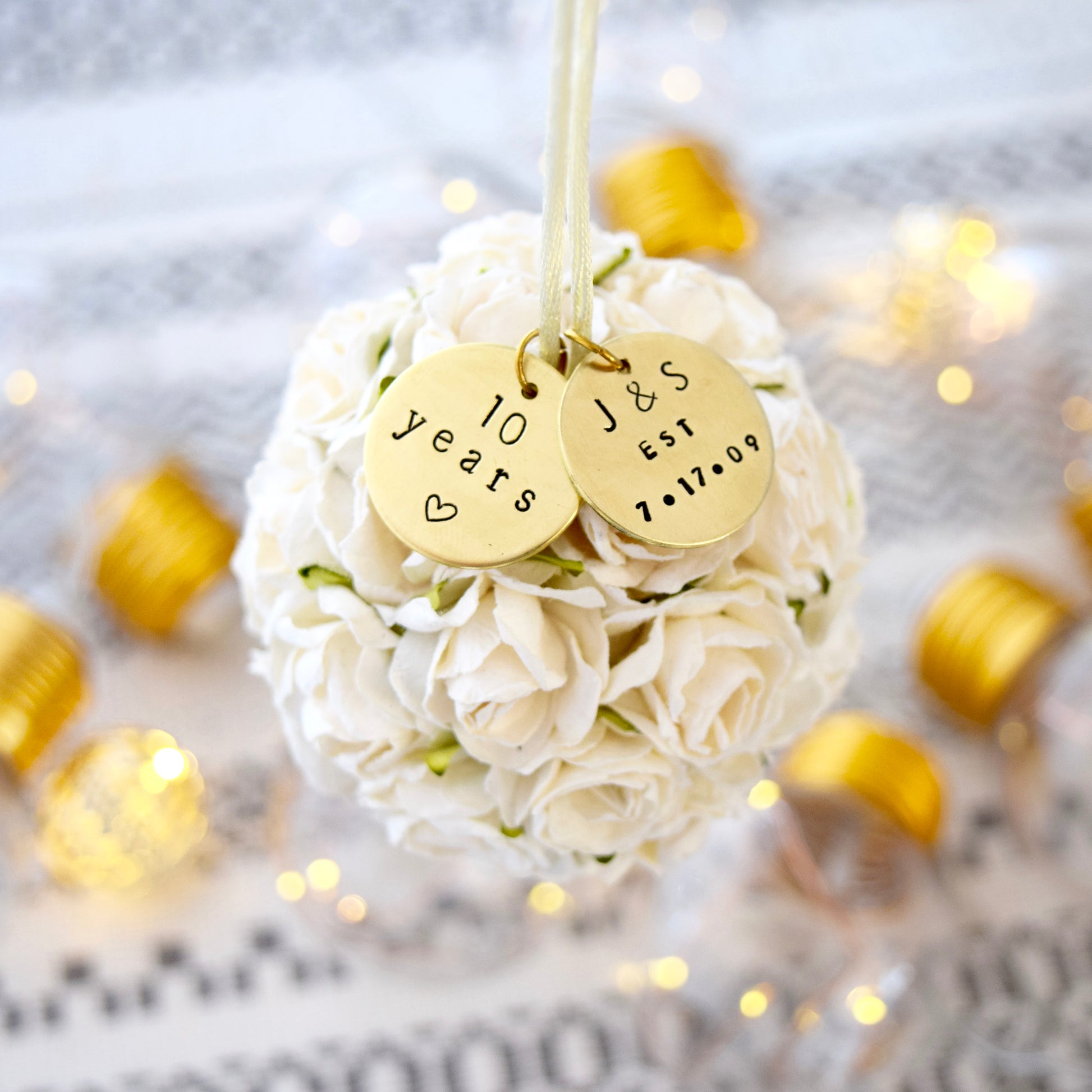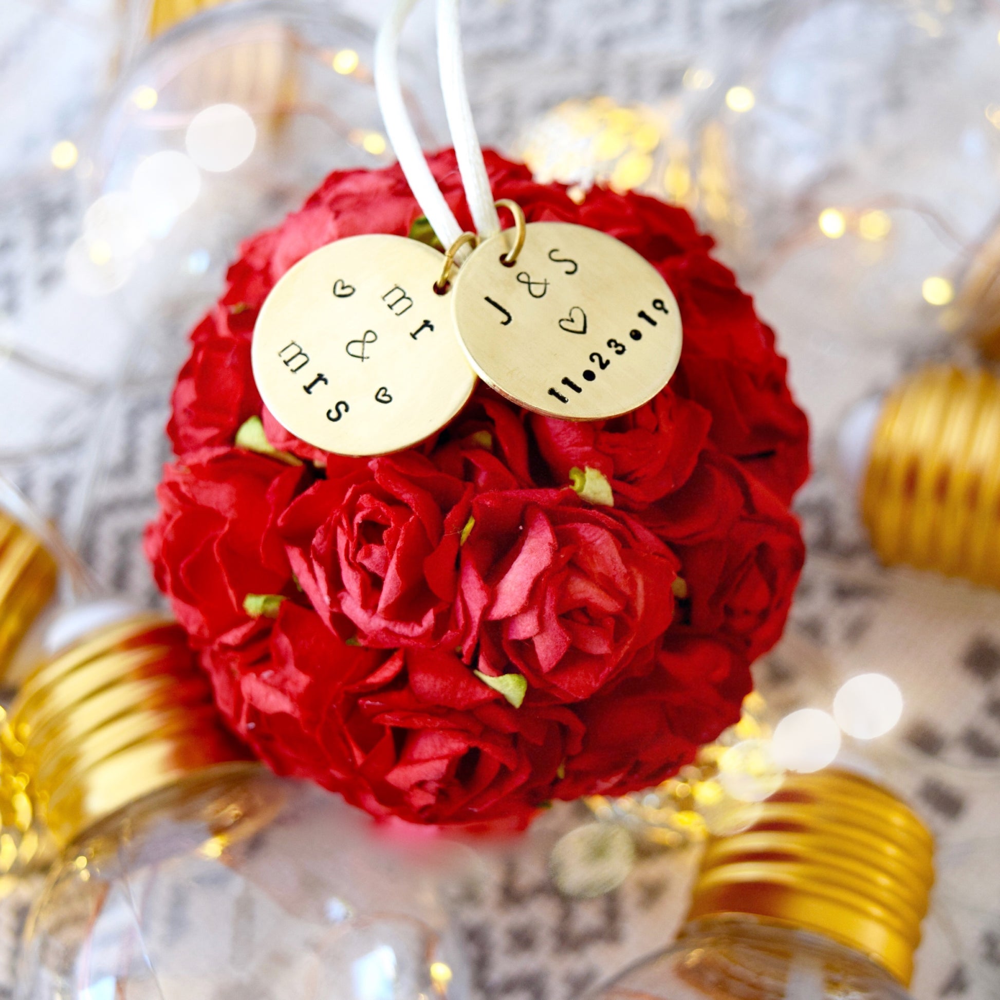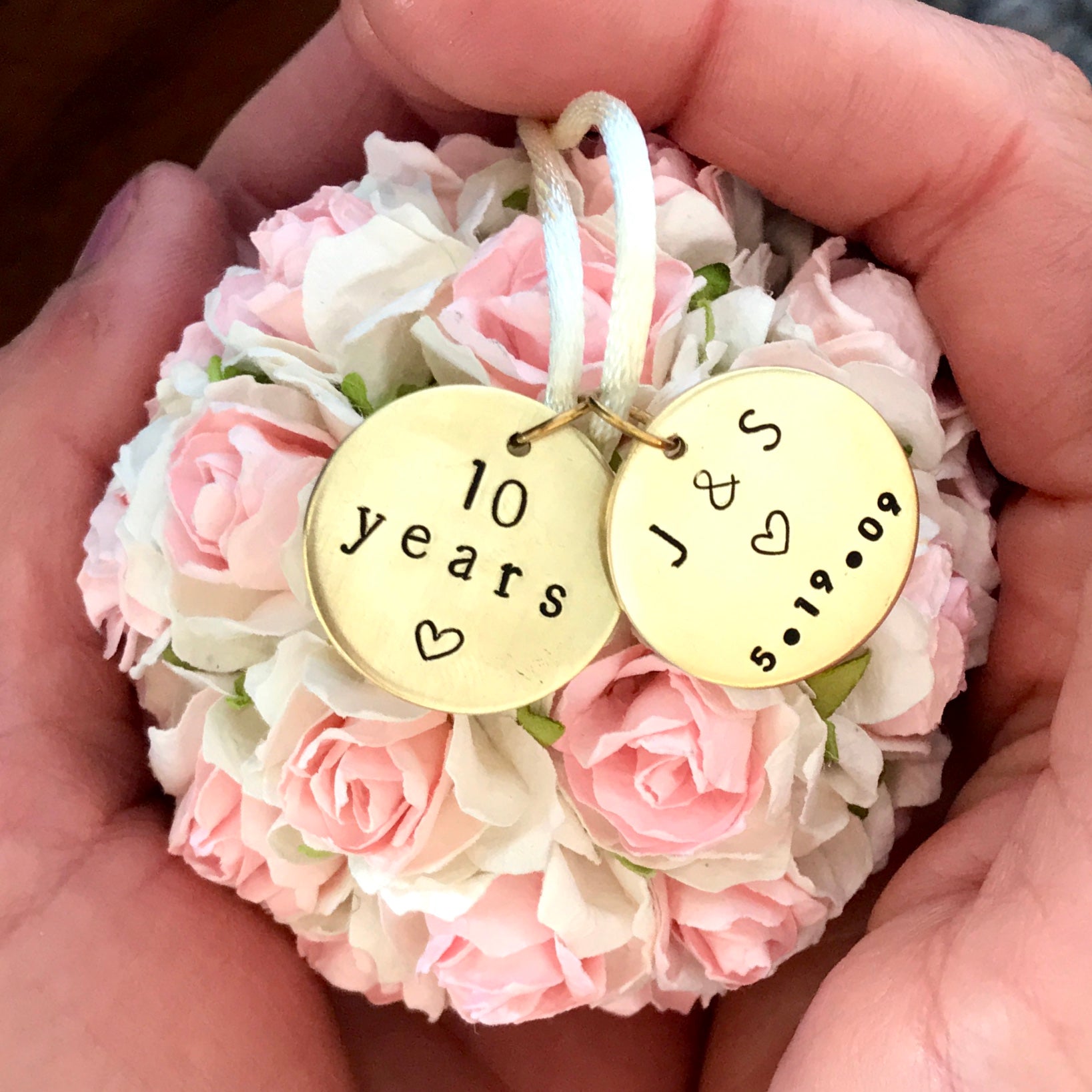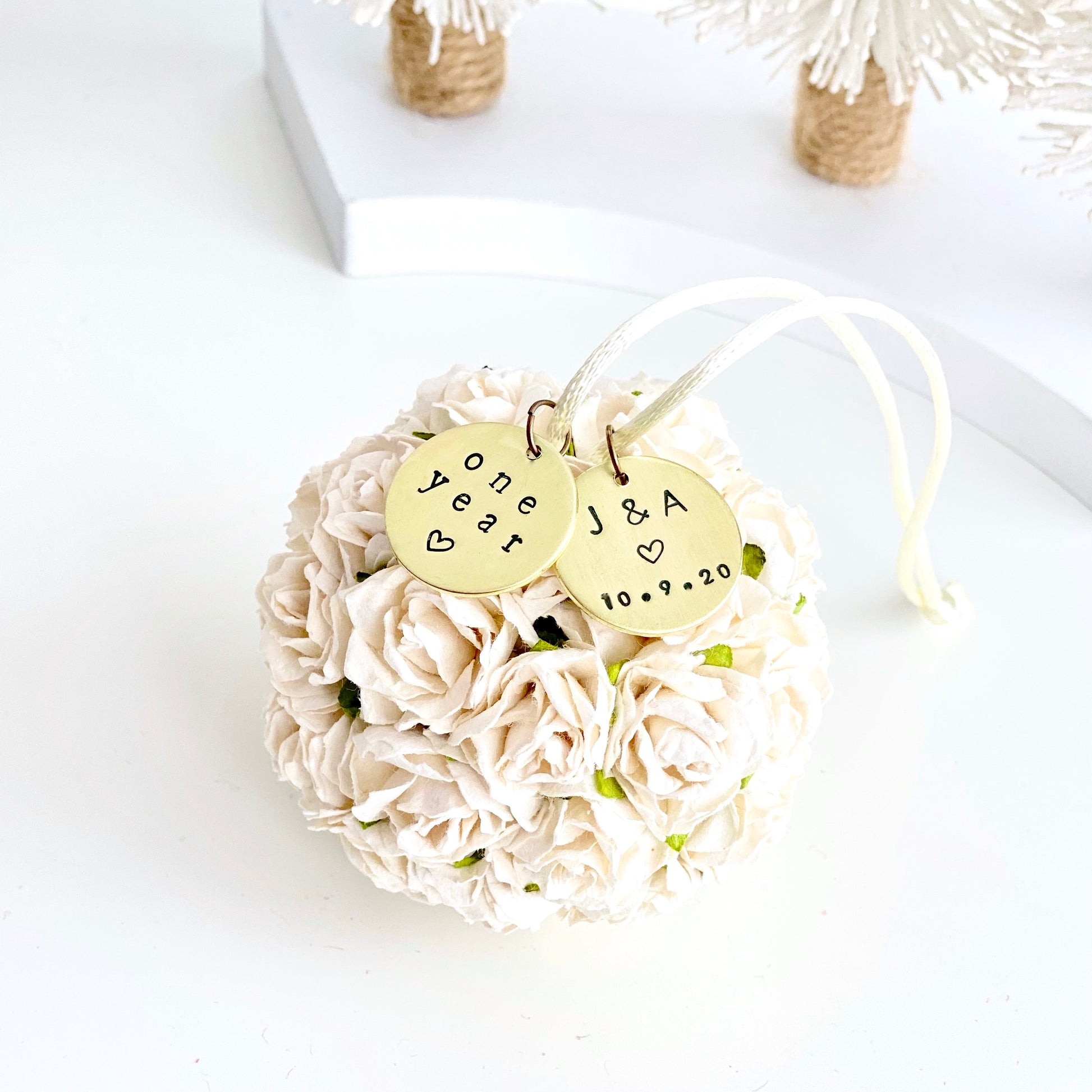 - Custom hand-stamped brass tags measure 20mm wide, and come personalized with your initials + special date.
